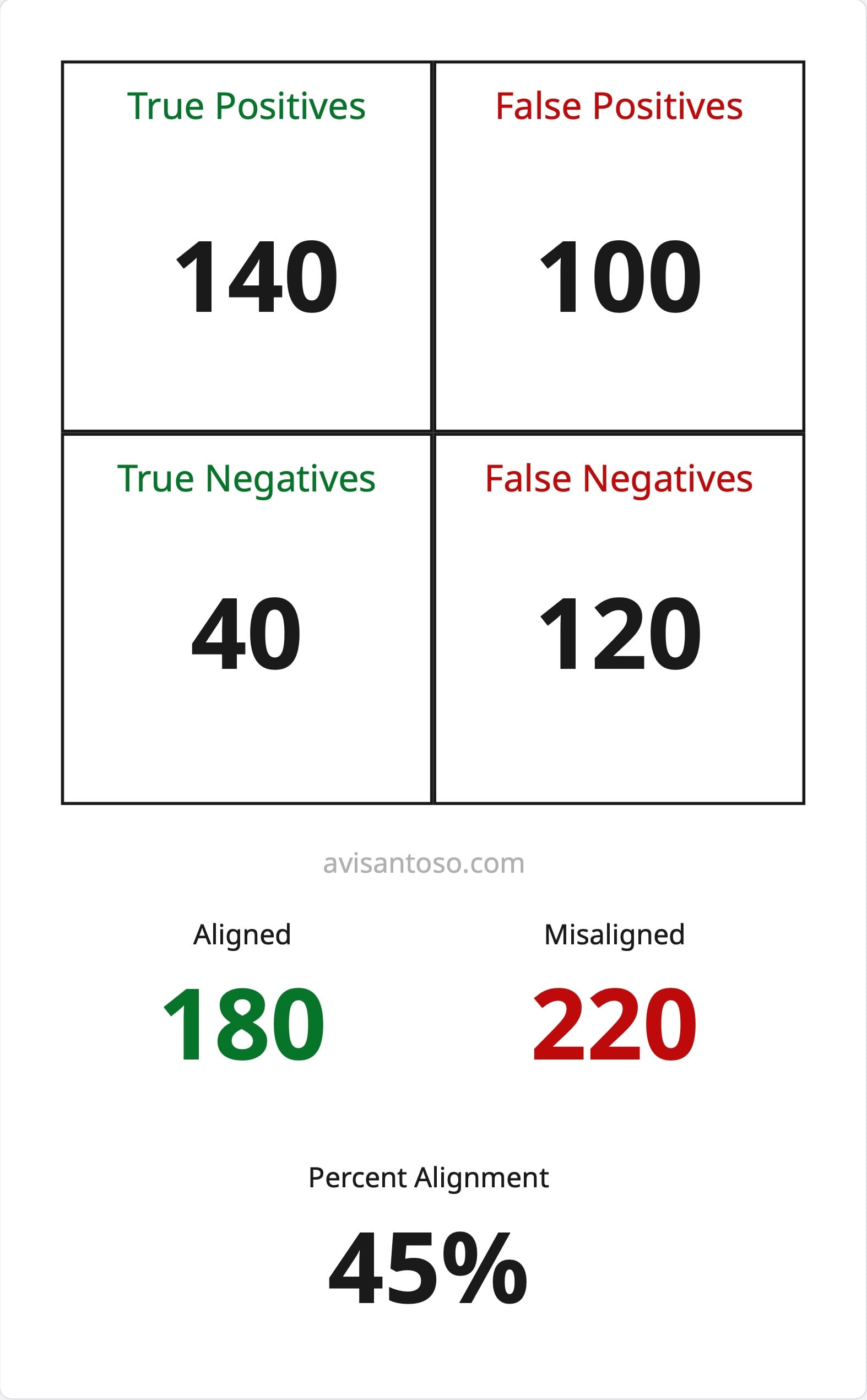 The key challenge with moving from a number like 45% aligned to 100% aligned is that we need to know why the evaluator disagrees.