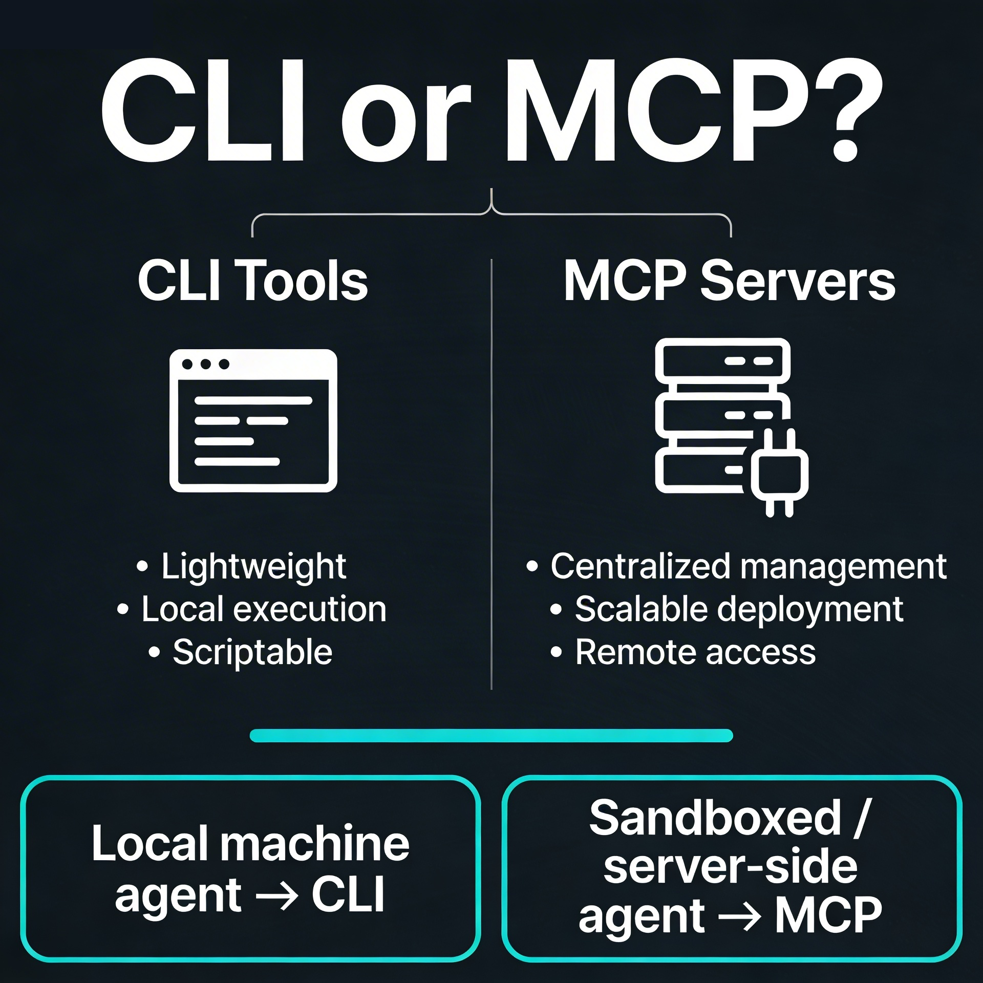 The short answer is this: if your agent runs on a local machine, use CLI tools. If your agent runs server-side in a sandboxed or narrow workflow, use MCP.