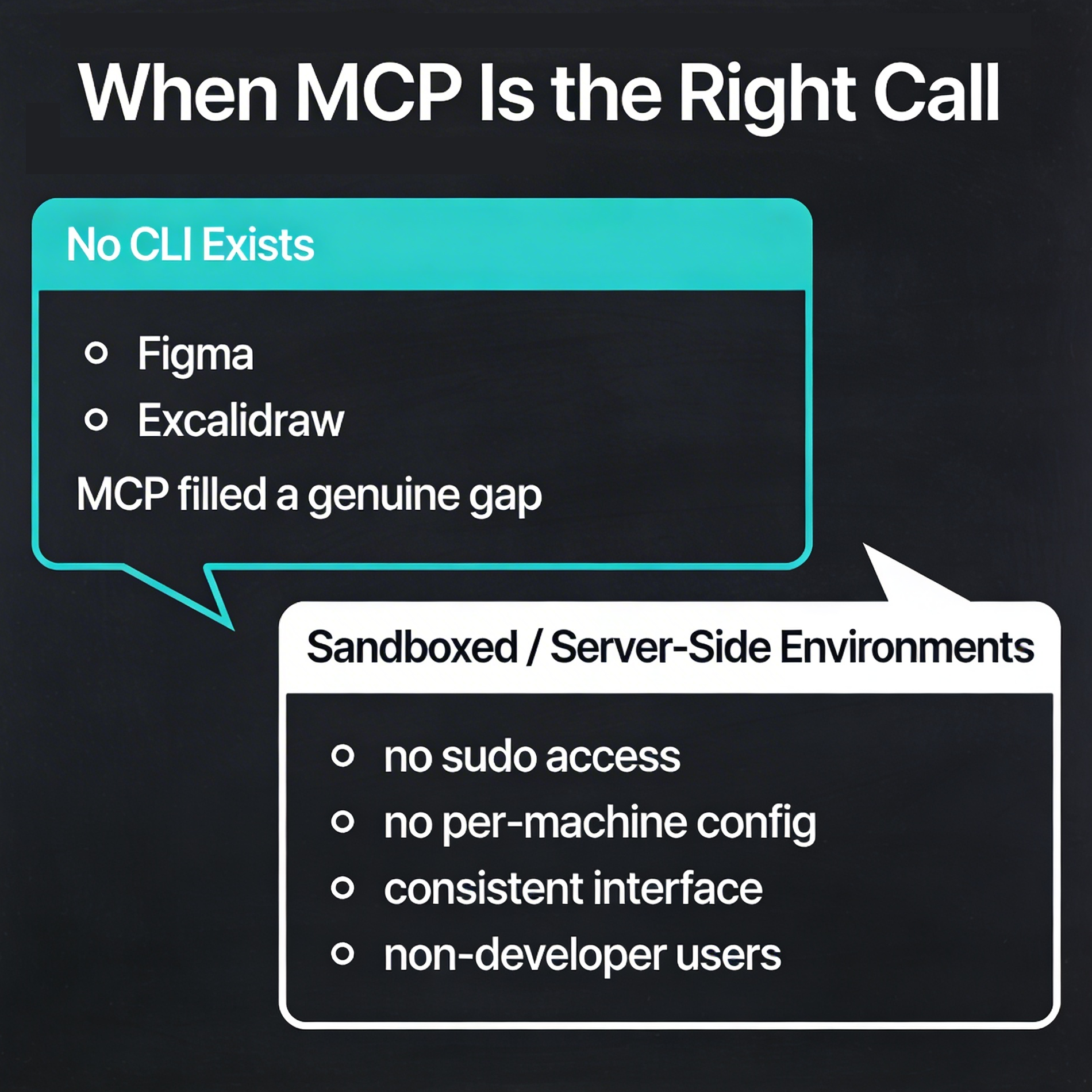 Another situation to use MCPs would be, if your agent is running inside n8n, a cloud-hosted workflow, or any sandboxed environment where you can't install software on the device.