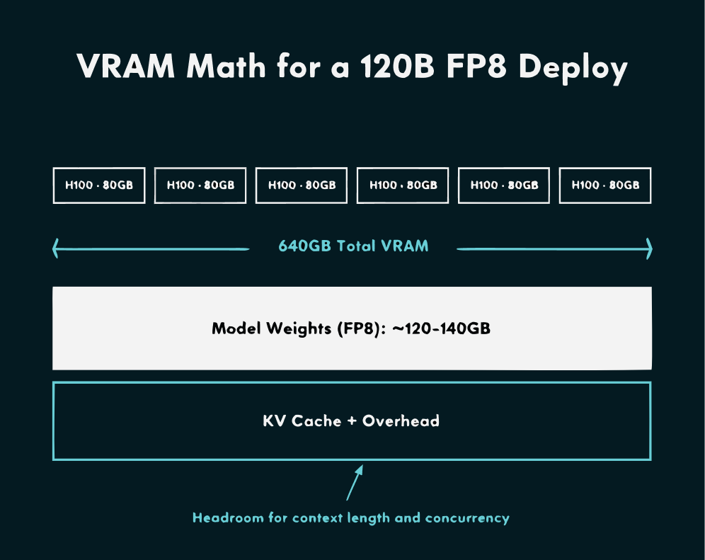 A 120B FP8 model needs roughly 120GB to 140GB just for the weights before you account for KV cache, and 8x H100 80GB gives you a 640GB VRAM envelope with enough room to work.[^3]