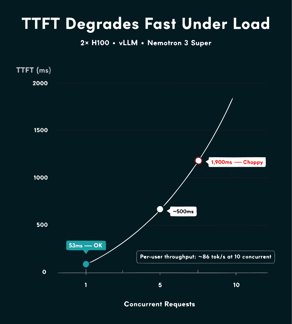 The targets I would use: under 100ms TTFT at a concurrency of 1, and around 100 tok/s per user at a concurrency of 10.