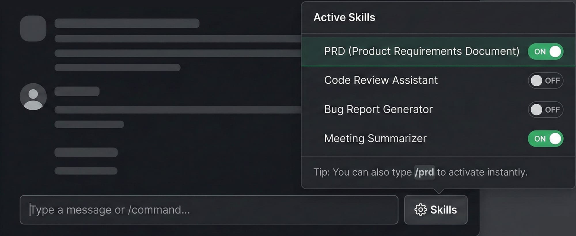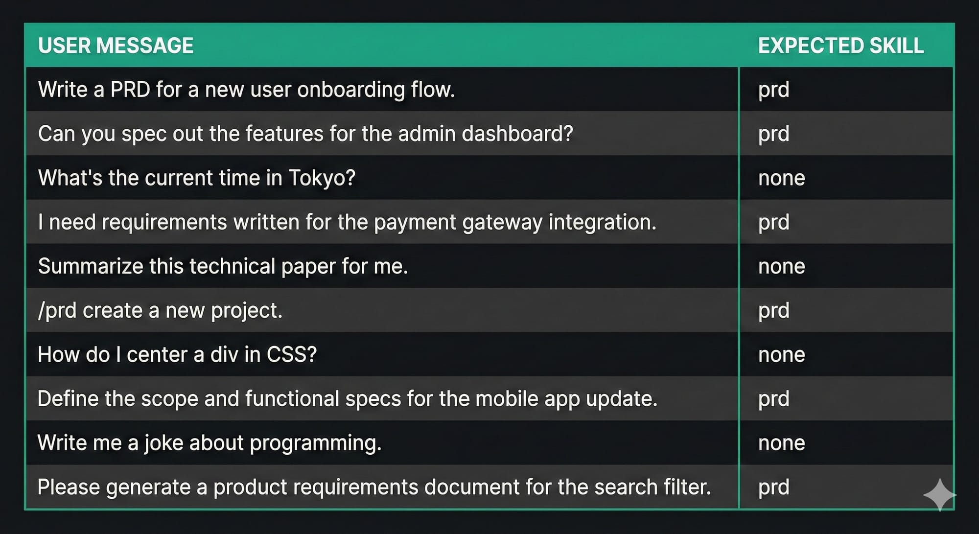 You're in essence building a classifier. This might be a separate router model, or it might be the main model with tool-choice. But in practice it is: “given this message, should we load PRD skill: yes or no.”