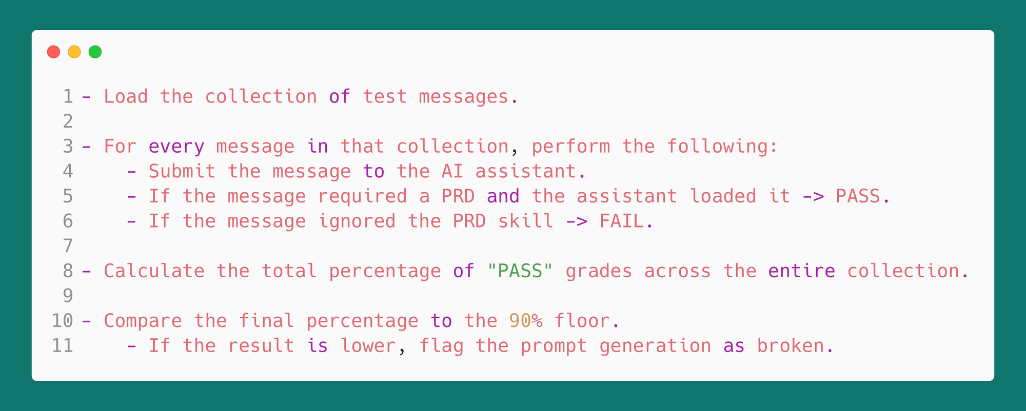 Once you say it that way, the engineering path becomes clear. You need tests, you need a dataset, and you need a target adherence rate.